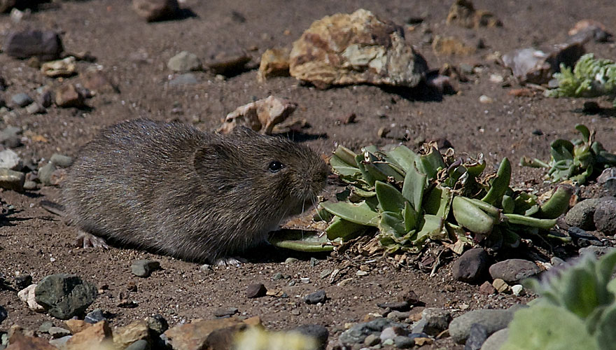 Voles are small rodents that measure 4 to 8.5 inches long and weigh 0.8 to 3 ounces and vary in color from brown to gray. They are pudgy, with blunt faces and small eyes, small and sometimes inconspicuous ears, short legs, and a short (the long-tailed vole is an exception) and scantily haired tail.